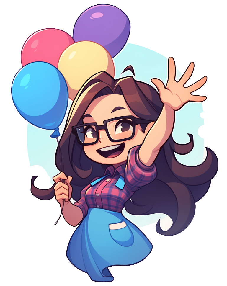 Die junge Frau mit den bunten Ballons winkt dir aufgeregt zu.